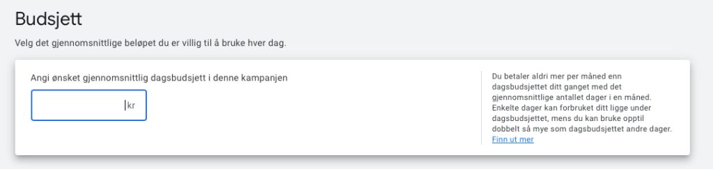 Ditt daglige budsjett setter grensen for hvor mye du er villig å bruke på en kampanje per dag. Dette gir deg kontroll over dine totale utgifter over tid, og hjelper deg å styre Google Ads pris effektivt.